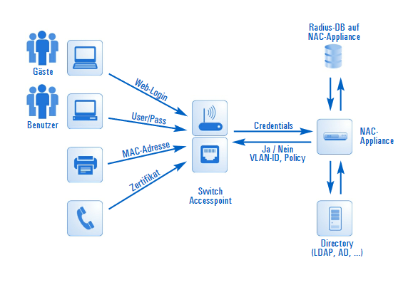 NAC Server ist das Herzstück, er kann inline oder auch Out-of-band sein. Unauthorisierte Devices können in ein Quarantäne VLan isoliert werden.